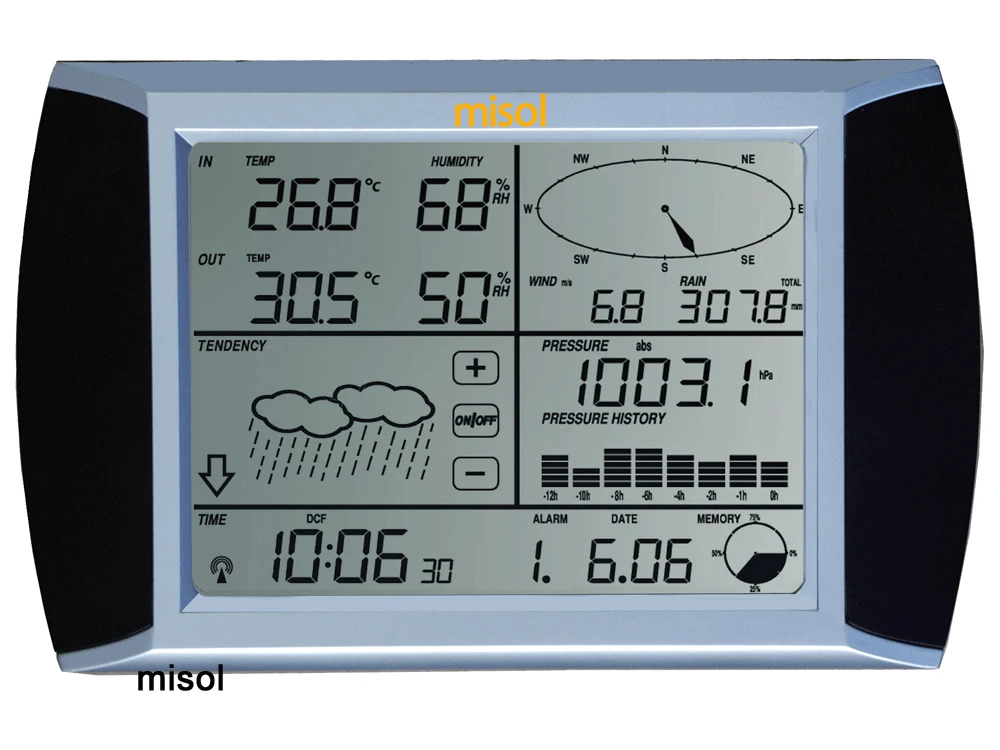 Освещенная банка: скорость ветра, направление ветра, дождь, температура (открытый и внутренний), влажность (открытый и внутренний), атмосфераДавление.