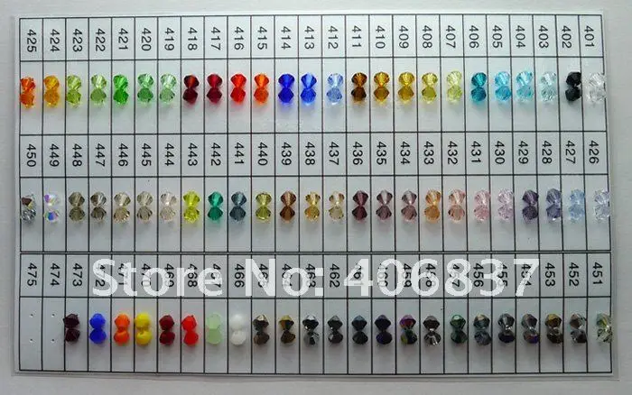 Размер: 4 ммФорма: биконусМатериал: литой кристалл K9Цвет: более 70 видов цветов. Свяжитесь с нами, мы можем отправить вам нашу цветовую таблицу для справки.
