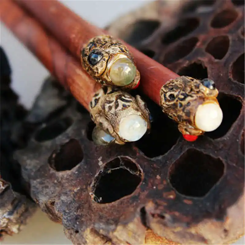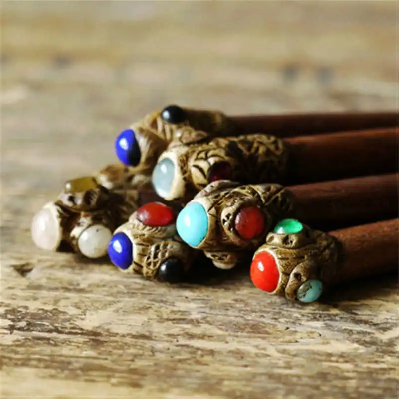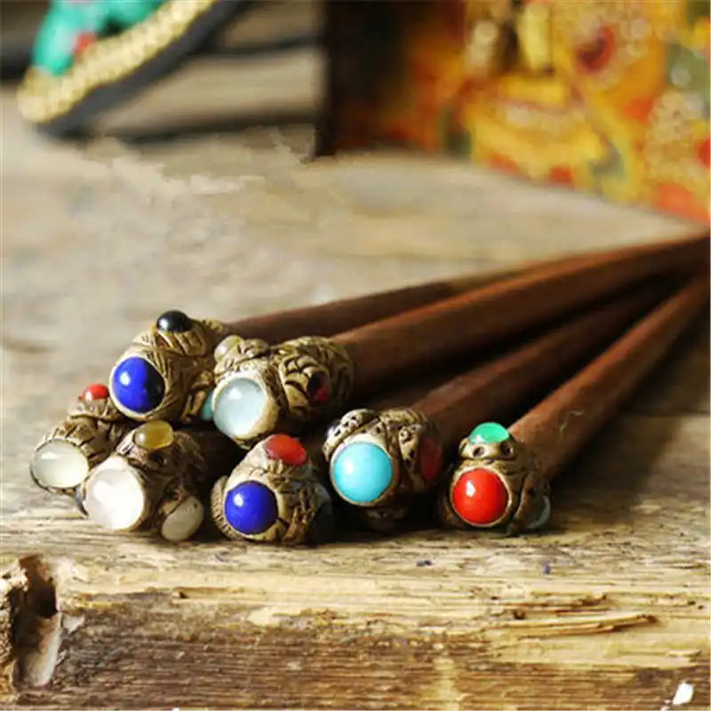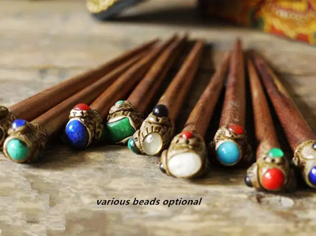 L031 винтажные деревянные палочки для волос Bodhi дерево инкрустация красочными бусинами шпилька для дам