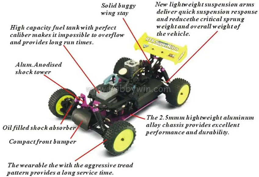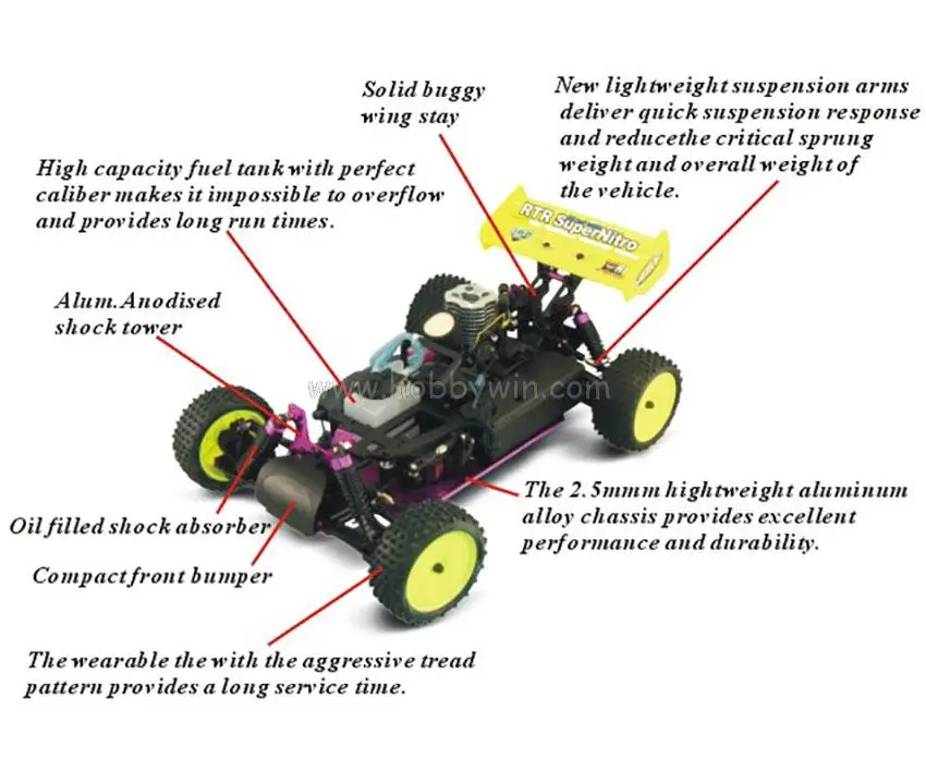 Особенности:01. Система четырехколесного привода.02. Передние/задние дифференциалы с хорошим качеством конических зубчатых колес, а также с 5 винтами довольно просты в обслуживании.03. 6061/T6 сплошной анодированный алюминиевый корпус.04. 13,8 г легкий алюминиевый маховик обеспечивает быстрый отклик двигателя.05. Цельные универсальные шарнирные чашки/Высокопроизводительные шариковые подшипники и шестерни в комплекте.06. Сменные накладки для дисковых тормозов обеспечивают быструю реакцию тормозов.07. Дополнительный Большой 75cc герметичный топливный бак с переливающейся трубой и пружинным наполнителем для быстрого повторного заполнения.08. Предварительно с оторочкой из агрессивной 1/10th масштаба шины для багги обеспечивают длительный службный срок.09. Четыре масляных амортизатора обеспечивают отличную защиту от ударов.10. Двойной пенопластовый воздушный фильтр с высоким потоком (пригодный для использования).11. Передний/задний бампер обеспечивают хорошую защиту от ударов при ДТП.12. Хорошее качество 1/10th колесный Багги диски и стильный 1/10th Багги крыло.