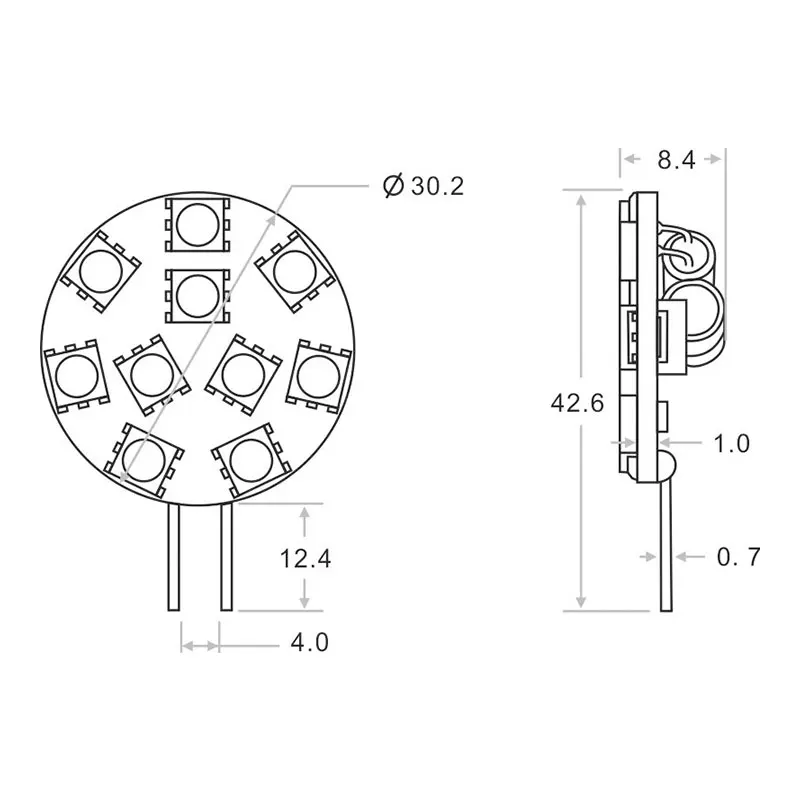 Товар: G4 светодиодный светильник 2 Вт Светодиодный светильник высокой мощности, светильник, 10 шт. 5050 SMD, светодиодный светильник для замены, 6400k Дневной светильник белый и 3500K теплый белый с G4 фитингом, соответствует стандарту GU53/ MR16 / MR11. 2 контакта, 200-220 лм яркость эквивалентна 15 Вт-20 Вт галогену. Также можно использовать d в домах для замены галогенных ламп 12 Вольт, оптимальное использование с источником питания постоянного тока. Длительный срок эксплуатации: Белый светодиодный До 50000 + часов (5,7 + лет), сэкономить на ваш счет за электричество путем замены их Применение Системы солнечной энергии, ветрогенератор, гидрогенератор Используйте дома при надлежащем напряжении постоянного тока Небольшие домашние проекты. Научные проекты. Электронные приложения. RV, яхты, лодки, корабли, автомобили, тележки Укажите Модель: G4-10-30A Светильник источник света: 10 шт. 5050 SMD Напряжение: 12 В 24 В Размеры: диаметр 30 мм, штифт 14 мм Угол луча: 180 ° Тип основания: G4 Освещение: 200-220лм Потребляемая мощность: 2 Вт Диммируемый, диммер для поверхностного монтажа Цвет: белый, теплый белый, холодный белый Би-полярности, способные