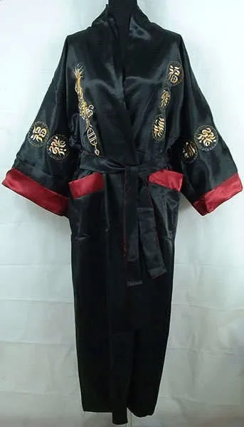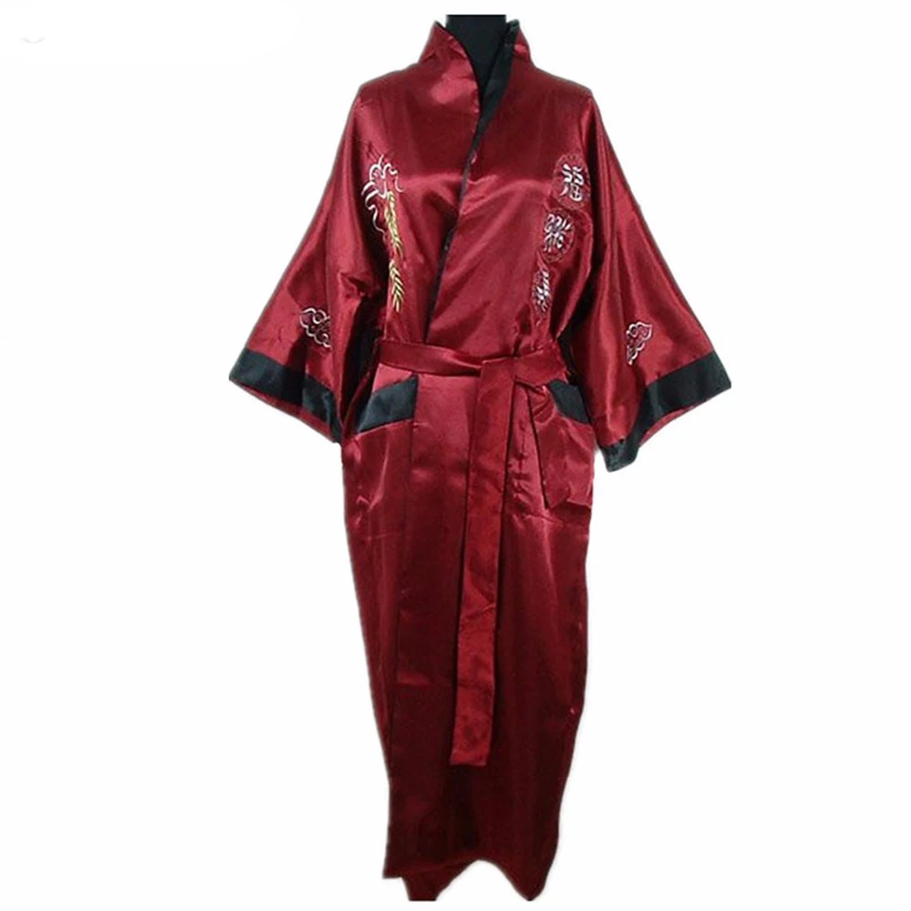 Женское двустороннее атласное кимоно, бордовое, черное, двустороннее, с вышивкой дракона, один размер, S3003