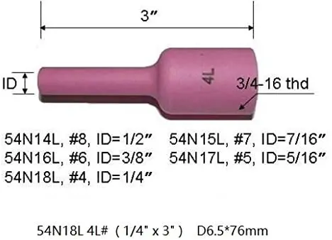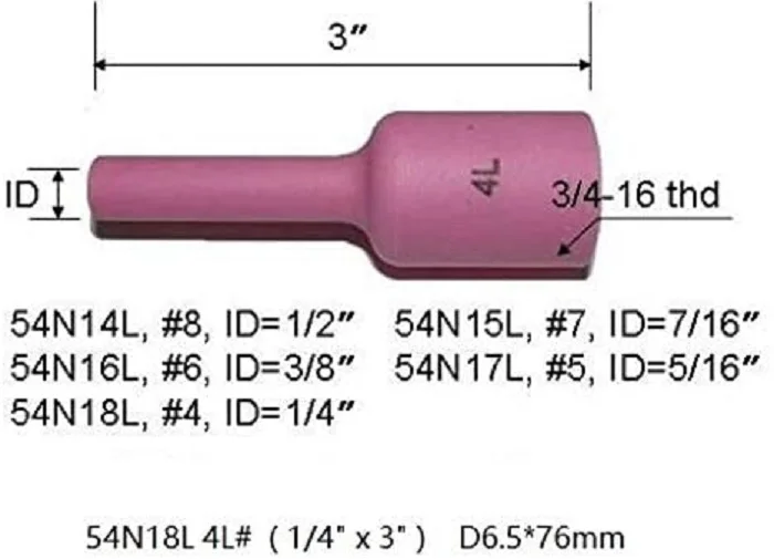 Посылка:5 шт. номер рефа: 54N18L ( # 4L 1/4 "отверстие) Размер: ( 1/4" x 3 " ) D6.5 * 76 ммЭтот набор подходит для всех факелов с воздушным охлаждением серии 17 и 26 и факелов с водяным охлаждением серии 18, включая PTA-17 Lincoln, PTA-18 и PTA-26, Miller Diamondback DB17, DB18 и DB 26 факелами, наряду с WP-17 Weldcraft, WP-18 и WP-26 факелами.
