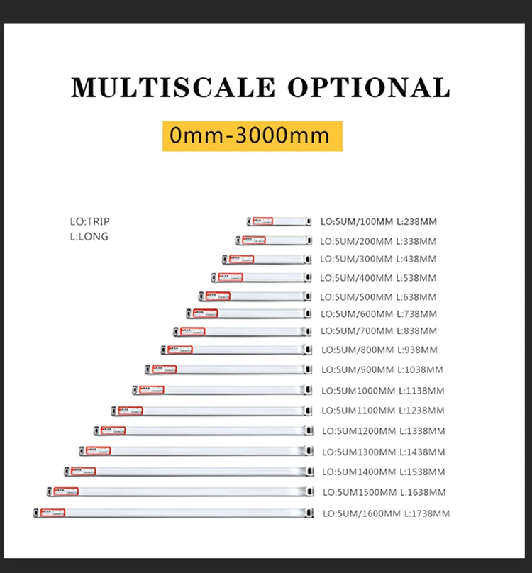 1. Этот заказ включает в себя: одну линейную шкалу с точностью 5u m, длину путешествия между 50-1000 мм (длину путешествия можно настроить, общая длина = длина путешествия + 138 мм). С монтажным кронштейном, соединительным кабелем, это один комплект.