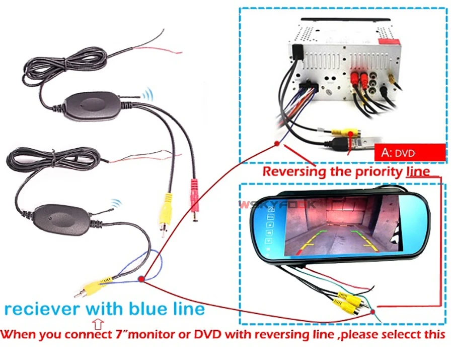 Когда ваш DVD с обратной линией или вы Подсоедините монитор 7 ", пожалуйста, отправьте приемник с синей линией.