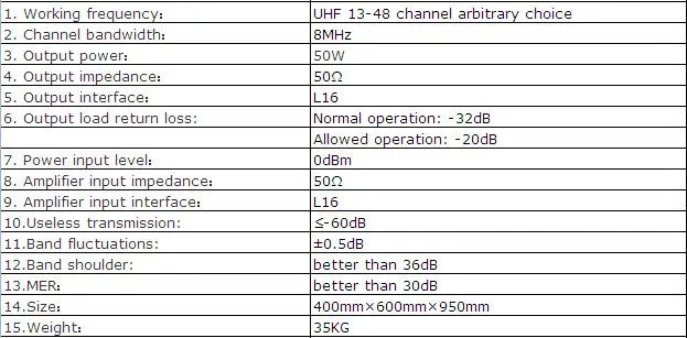 50W цифровой вещательный ТВ передатчикТехнические характеристики