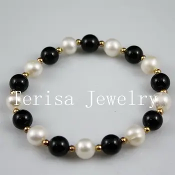 Очаровательная! Жемчуг + агат а . а . 8 - 9 мм белый подлинная пресной воды жемчуг + черный агат резинка браслет 7.5 ''inchs новый бесплатная доставка ... icon star icon star icon star icon star icon star