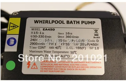 EA Line pump является одним из самых зрелых на рынке водоворотных насосов и настоятельно рекомендуется для джакузи, ванны, гидромассажной ванны и спа-салона. Все контакты жидкости изготовлены из высококачественной инженерной пластмассы, качественные механические уплотнения обеспечивают непрерывную работу. Жидкости в насосе будут самоосушены после остановки двигателя из-за нижней входной конструкции.