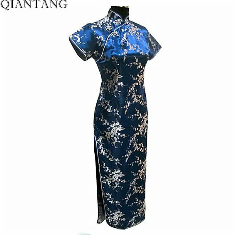Женское винтажное атласное платье Ципао темно-синего цвета в китайском стиле, вечернее платье с цветами размера плюс, S, M L XL XXL XXXL 4XL 5XL 6XL, J3089