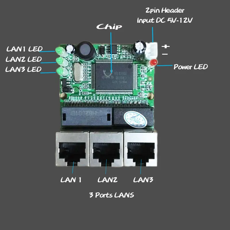 Он обеспечивает 3 порта 100Mpbs порт s, используйте встроенную или встроенную машинуВнутренние расширительные порты машинного устройства, переключатель с 3 портами очень хорошая теплоотдача