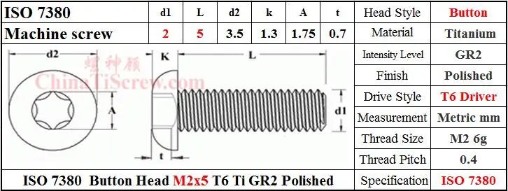 T6 Драйвер M2 титановый винт M2x2 M2x3 M2x4 M2x5 M2x6 M2x8 M2x10 ISO 7380 полированная кнопочная головка Ti GR2