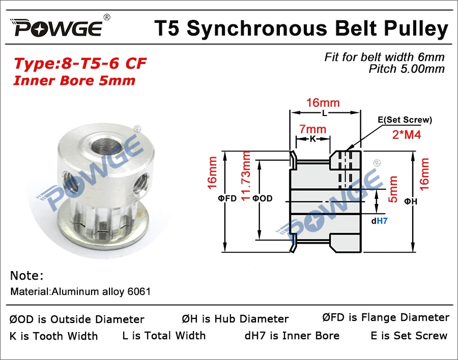 Метрическая трапеция POWGE, 8 зубьев, синхронный шкив T5, отверстие 5 мм для ширины 6 мм, шаг ремня ГРМ T5 5,00 мм, 8 зубьев 8 T