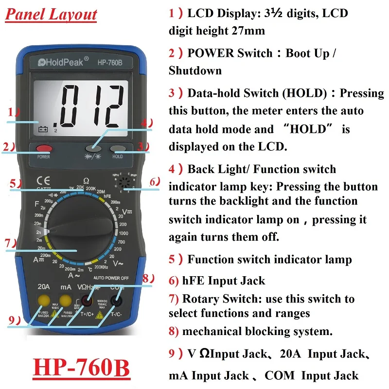 Цифровой мультиметр HoldPeak HP-760B x1 Руководство пользователя на английском языке x 1 Тестовые провода x1; Датчик температуры x1; Чехол для переноски x 1