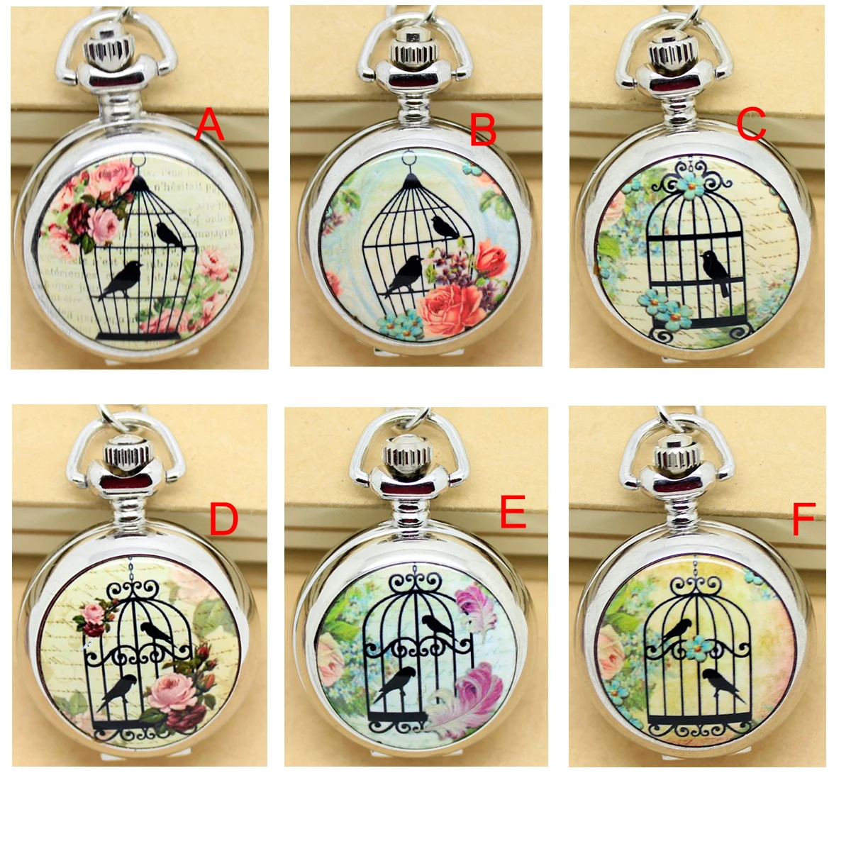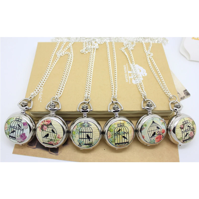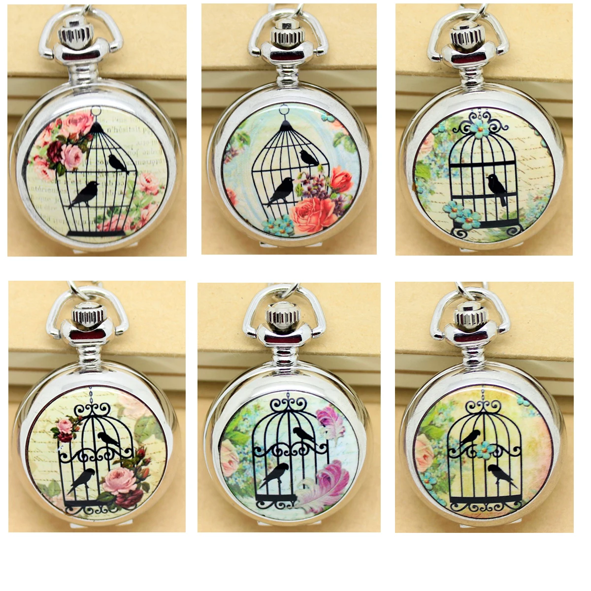 12 шт.лот ретро мини карманные часы ожерелье и шрифт Цветочная птичья клетка Fascia диаметр 2,8 см смешанный дизайн. 2 шт. Бесплатная доставка