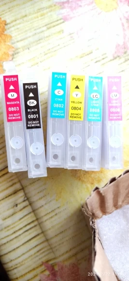 1 X T0801 черный многоразовый картридж (пустой) Голубой многоразовый картридж T0802 (пустой)-1 шт. 1 пурпурный многоразовый картридж T0803 (Пустой) 1 X Желтый многоразовый картридж T0804 (Пустой) 1 X T0805 светло-голубой многоразовый картридж (пустой) 1 X T0806 светло-пурпурный многоразовый картридж (пустой)Примечание! Эти картриджи пустые!