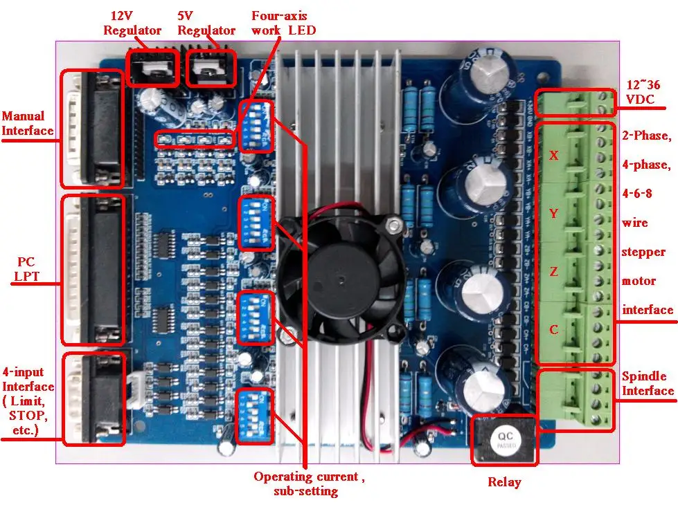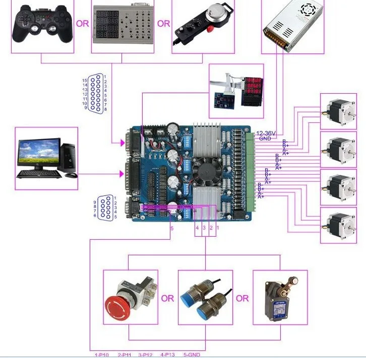 4, Мощность, пожалуйста, возьмите 12 ~ 36V 8A (шаговый двигатель в соответствии с работой согласование тока) приведенные выше импульсный источник питания Мощность, я получил карта с указанием Мощность входной интерфейс.