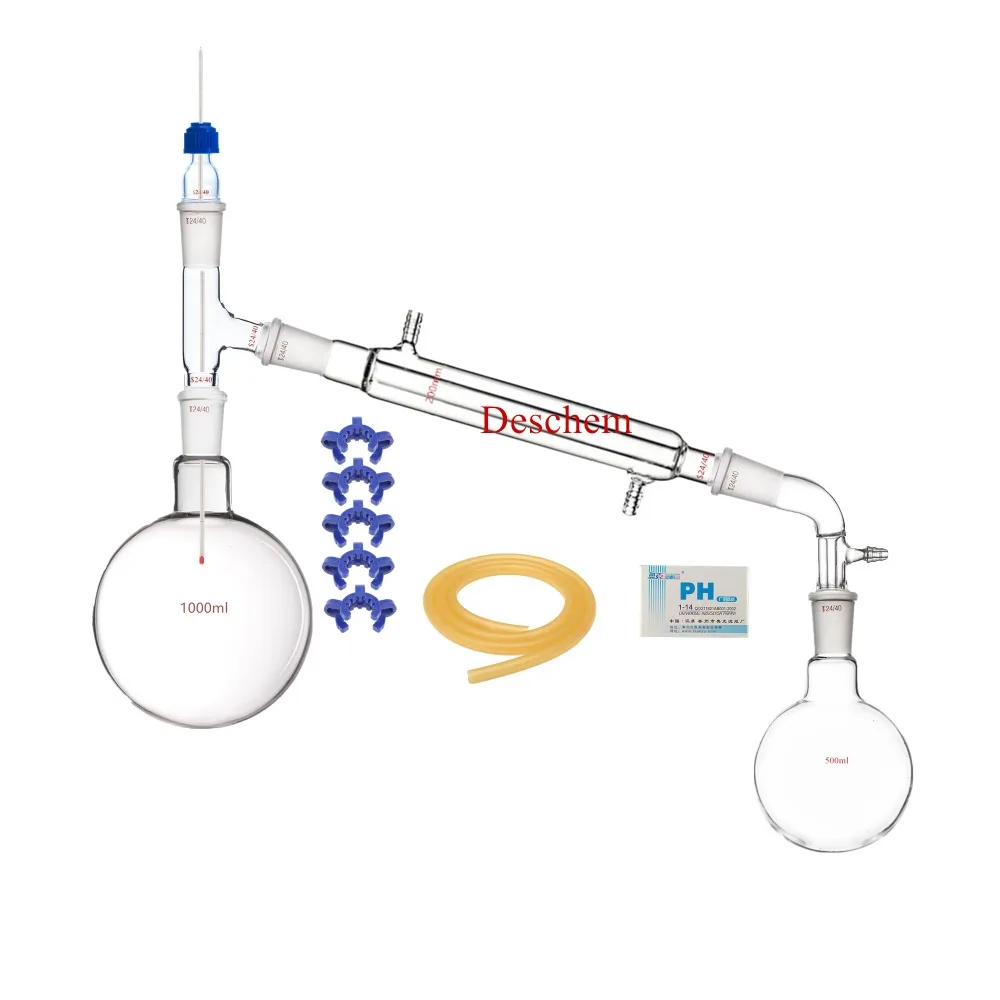 1000 мл, 24/40, аппарат из стекла для дистилляции, лабораторное вакуумное устройство для дистилляции 1. Пластиковый зажим для 24/40 соединения 5 шт. 2. Вакуумный адаптер, 24/40 105 изгиб 1 шт. 3. Адаптер термометра с винтом, 24/40 соединение 1 шт. 4. 3-сторонний выход перегонки адаптер 5. 1000 мл, фляга с круглым дном, одна горловина, 24/40 1 шт. 6. 500 мл, фляга с круглым дном, одна горловина, 24/40 1 шт. 7. 200 мм, 24/40, конденсатор Liebig 1 шт. 8. Резиновый шланг id6 мм od9 мм 2 метра 9. Термометр Цельсий 300 мм 200C 1 шт
