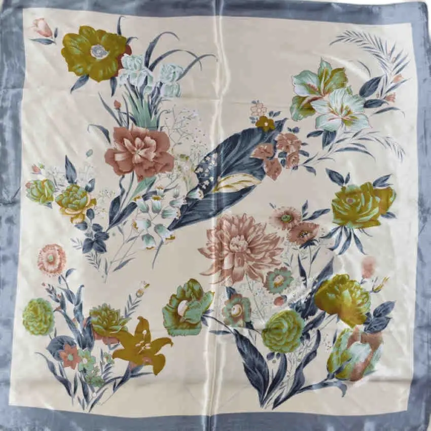 Новое поступление 2015 г., женский шелковый шарф, модные аксессуары, атласный большой цветочный принт, новый дизайн, бежевая шелковая шаль 90*90 см