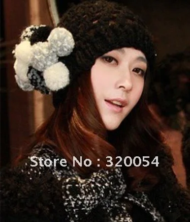 Бесплатная доставка, 1 шт., 2012 модная женская шапка, вязаная шапка, милые шерстяные шапки с помпоном, осенне-зимняя теплая шапка, черная.