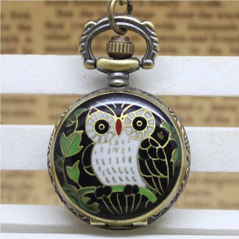 (3023) 12 шт.лот винтажная эмалированная цветная Золотая фольга в рельефной совой карманные часы ожерелье подвеска, подарок Вечерние