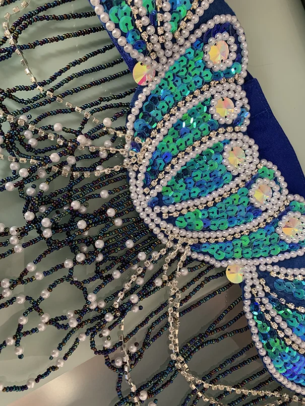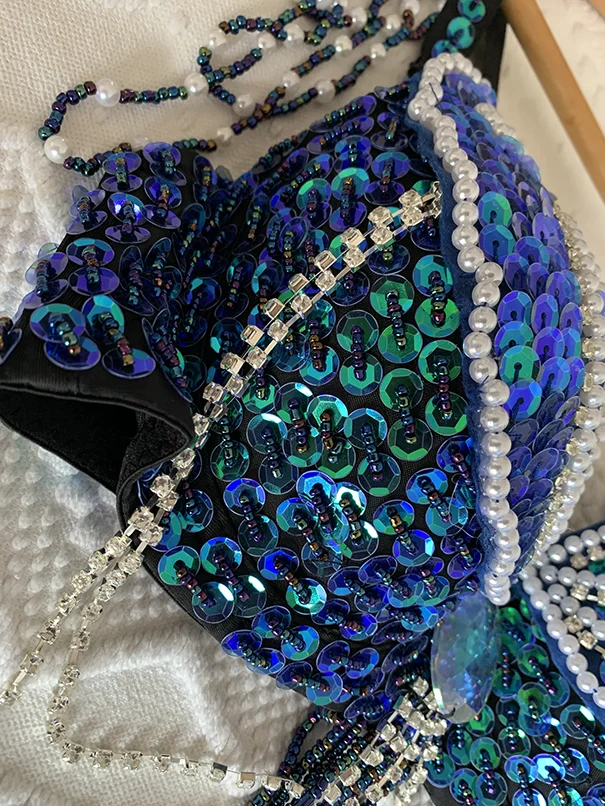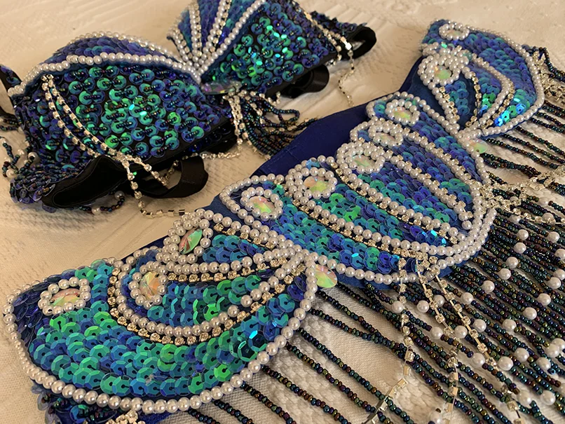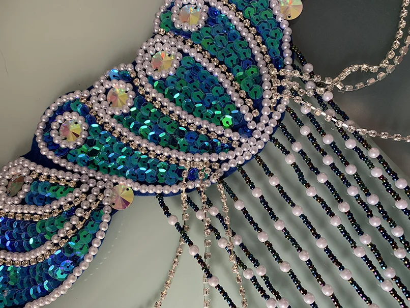 Красивый комплект! Бюстгальтер очень прочный и идеально сидит. Убедитесь, что все ваши измерения правильно соотносятся на 100% с таблицей размеров. Красивые цвета, Бюстгальтер черный, но синий выделяется, стразы очень блестящие. Ремень крепится на липучке, а также хорошо сидит. Мне понравилось, что он поставляется с дополнительными бусинами, в случае, если он выпадает. Ожерелье-хороший подарок, хотя и не так хорошо сделано, как в остальном наборе.