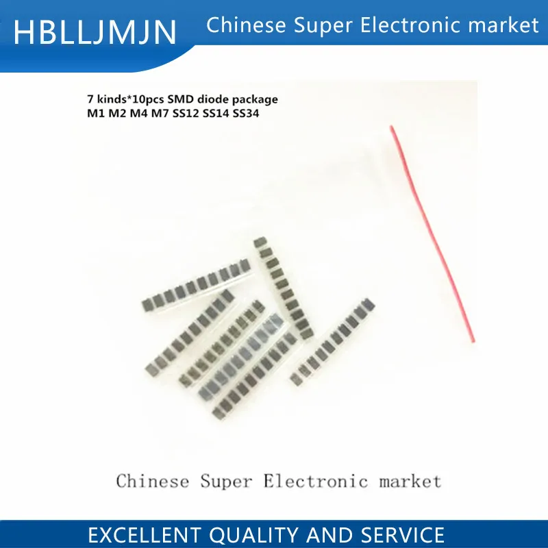 7 видов * 10 шт. = 70 шт.лот SMD упаковка диодовM1 (1N4001) M2 (1N4002) M4(1N4004) M7 (1N4007) SS12 SS14 SS34 Tra