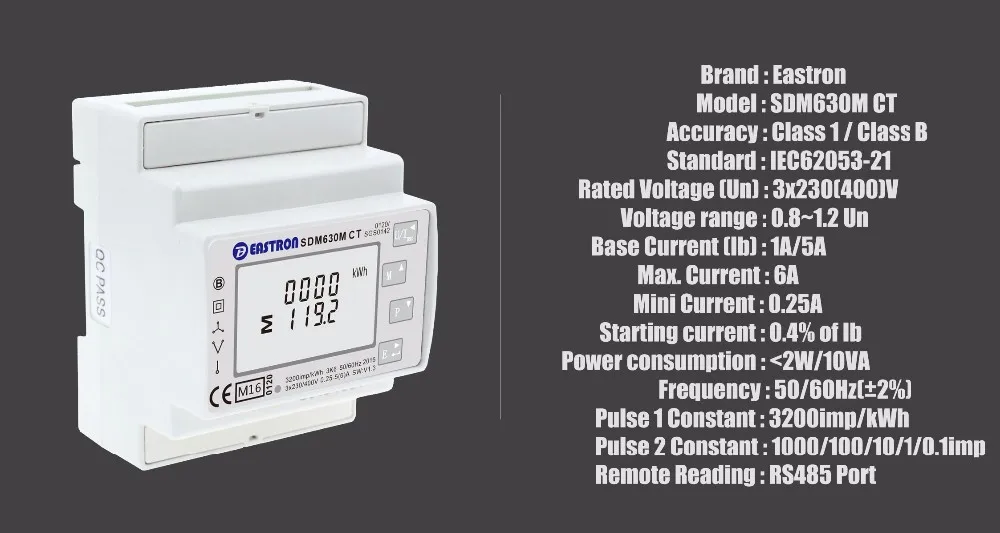 SDM630MCT, 1А5А CT подключен, 3-фазный din-рейка Многофункциональный счетчик электроэнергии, ЖК-экран с подсветкой; ИмпульсныйRS485 Modbus RTU выход