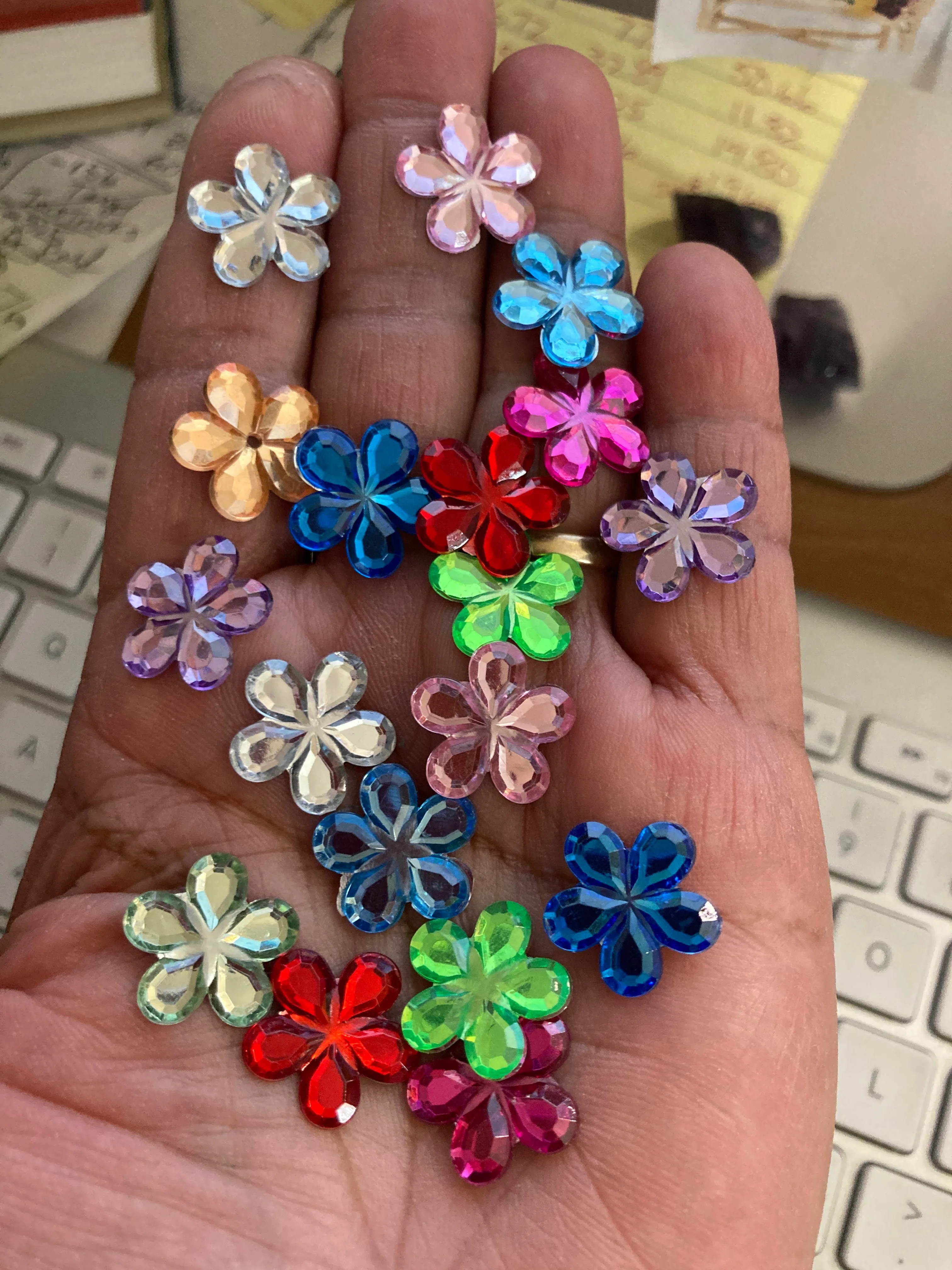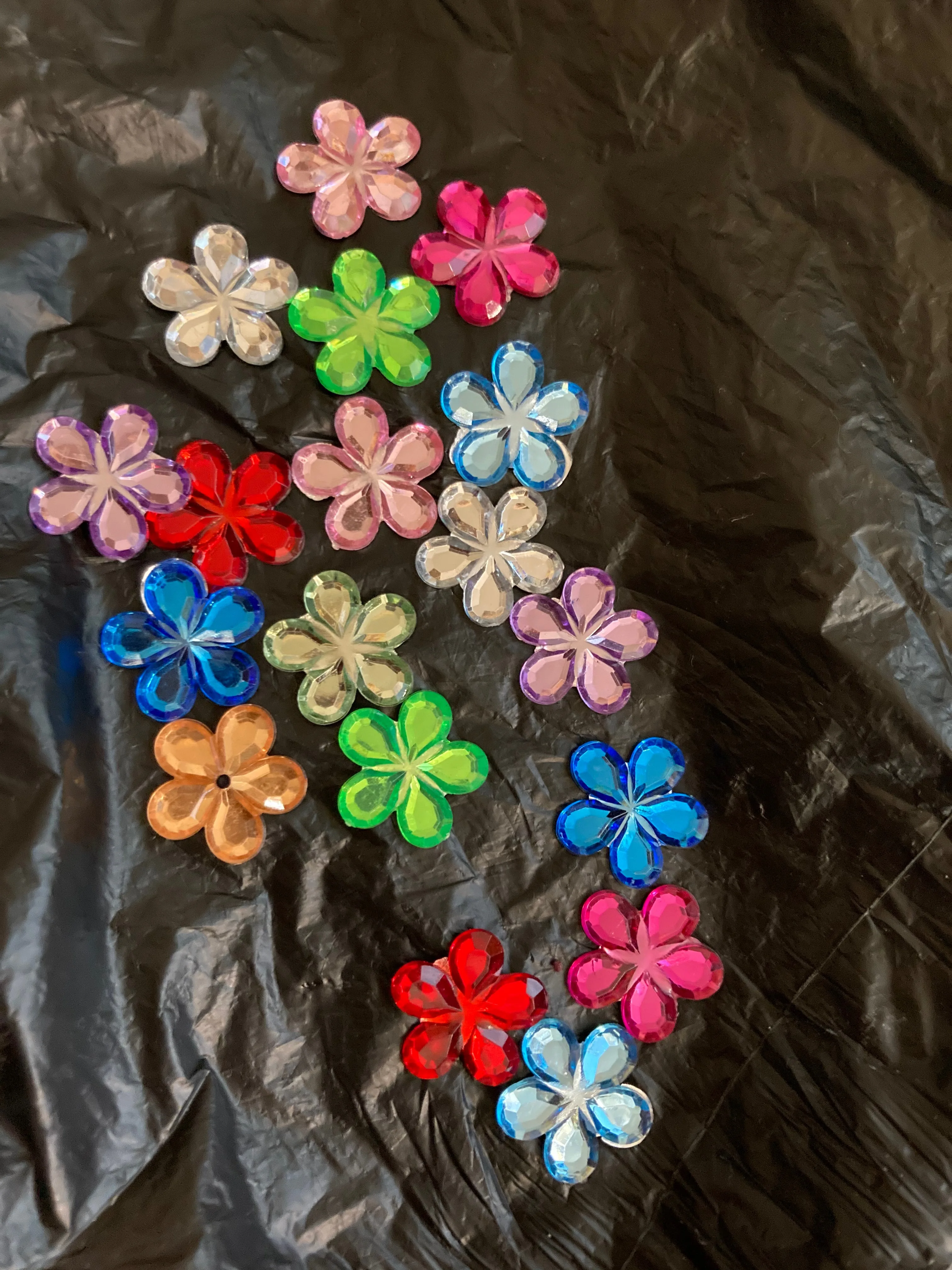 Shipped in a timely manner. Crystall flowers (3 packets) came with the many packets of stars I had ordered, as well as another order from another company. None of the flowers were broken or damaged. Colors are bright/vibrant whether on a black or white background! I like these colors even better than the ones I purchased from the "Dollar" store chain here in the U. S.. These is NO HOLE in the center of these flowers. FLASH: If you look at picture #2, the light blue flower near the palm of my hand has some "flash" visable. It was easily broken off using my fingernail [though not perfectly smooth afterwards, it was no longer unsightly]. I didn't take time to count them, but if the count is good, I'll will reorder.