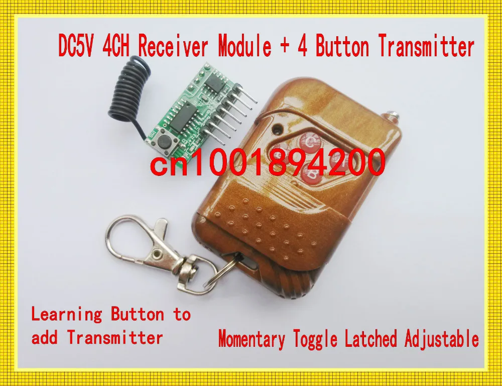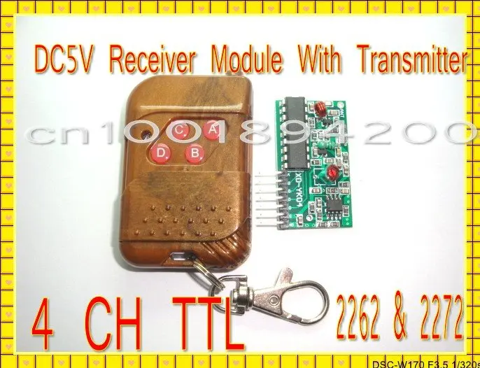 Беспроводной пульт дистанционного управления включает в себя 4-кнопочный пульт дистанционного управления и модуль беспроводного приемника Компактный пульт дистанционного управления с защелкой для удобной переноски и крепления Применение: электрические ворота, силовые дверные замки и стыковка SCM Размер: 36*24*5 мм Рабочее напряжение: 3-12 В постоянного тока (Мы предлагаем пионт-прессование, лучше не передавать непрерывно, если вам нужно пропускание непрерывно в течение 3 секунд, лучше использовать напряжение менее 9 В. Или он будет гореть) Рабочий ток: 14-48 мА Режим колебания: пила Режим модуляции: ASK Мощность передачи: 32 МВт IC кодирования: PT2262 Частота: 315 МГц (433 МГц можно настроить) Передача сигнала 4 CH
