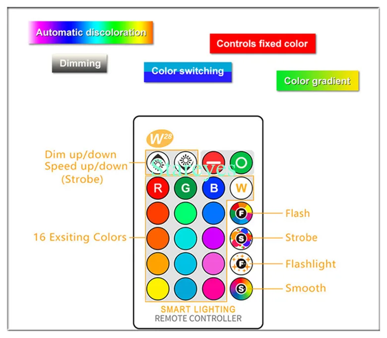 Функция ИК-пульта дистанционного управления: вкл/выкл, тусклый вверх/вниз, вспышка, стробоскоп, гладкая