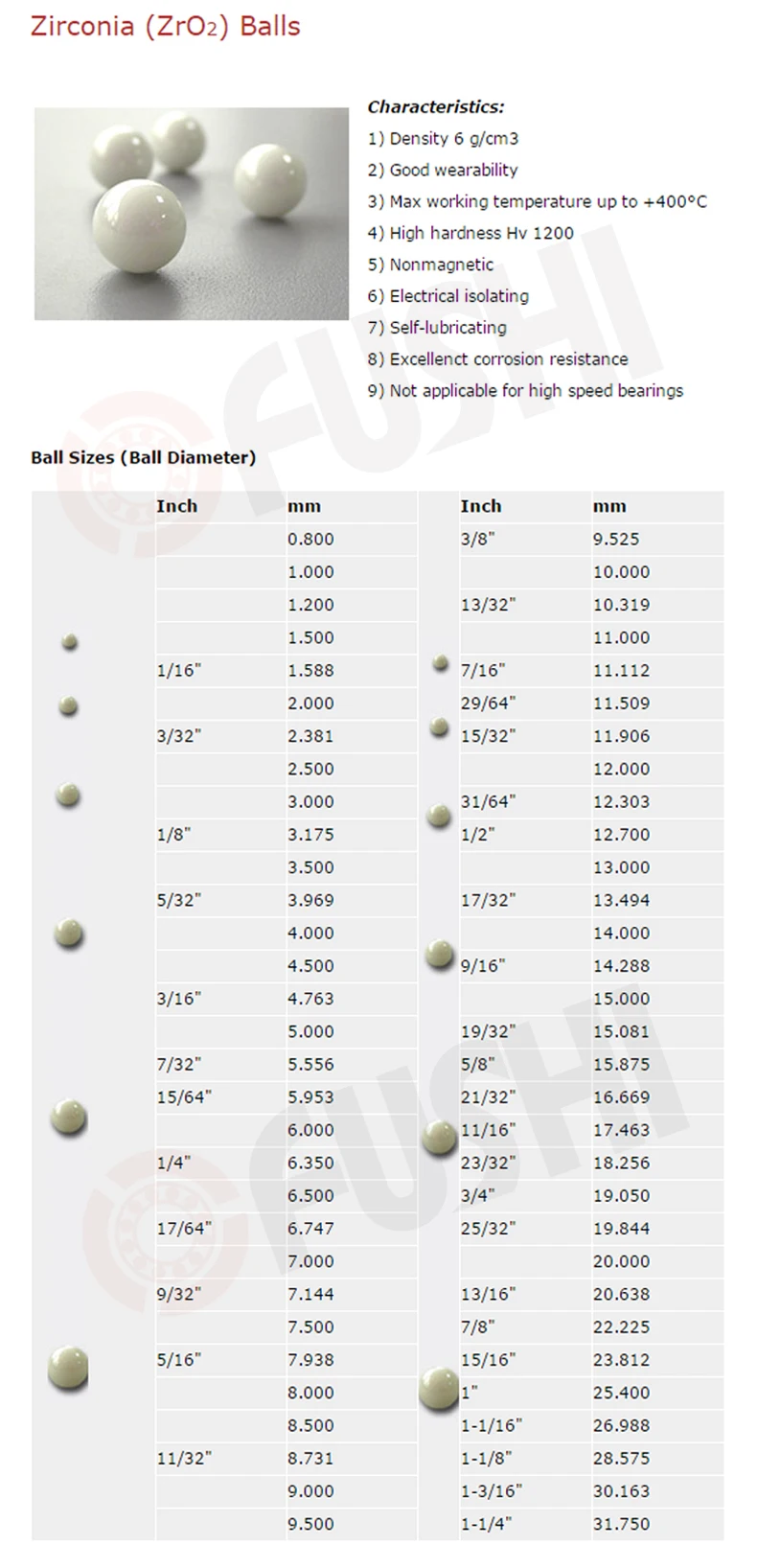Из-за особенностей высокой прочности трещин, высокой прочности на изгиб, высокой износостойкости, отличного теплоизоляционного свойства и правильного коэффициента теплового расширения, который закрывает сталь, цирконий (ZrO2) керамические шарики широко используются в керамических полях подшипников. Кроме того, стоимость намного ниже, чем нитрид кремния.