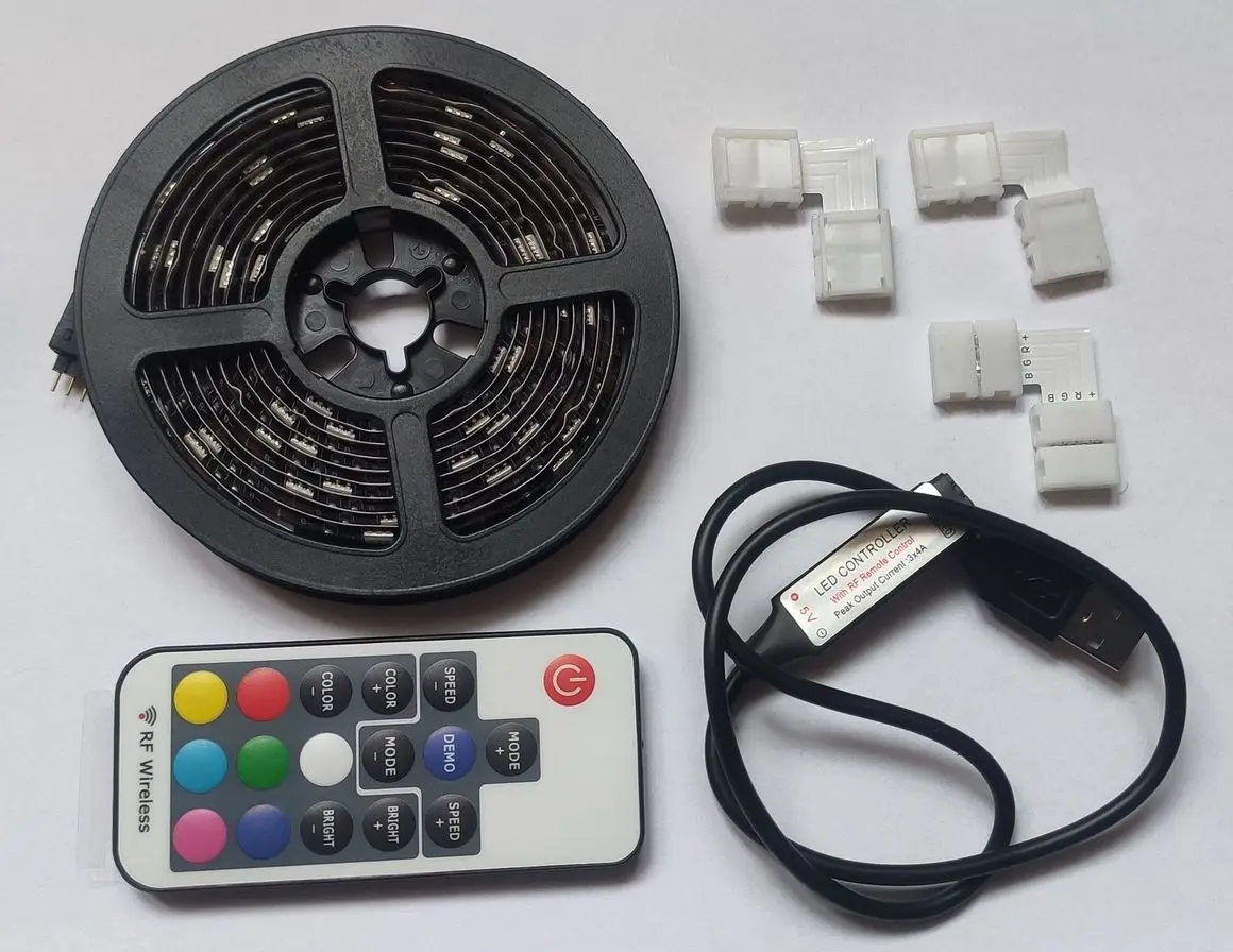 Все работает. Соответствует описанию В комплекте: контролер с пультом (пульт с батарейкой), лента и три коннектора для ленты - угловые, L образный LS с защёлками. Качество хорошее. Очень быстрая отправка и доставка. Рекомендую.