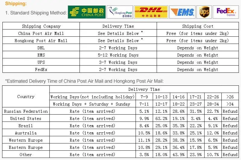 2. Для веса товаров> 2 кг: Обычно мы отправляем его ems EMS/DHL/UPS (время доставки требуется 3-15 рабочих дней); Или отправляем посылки twe авиапочтой Китая.