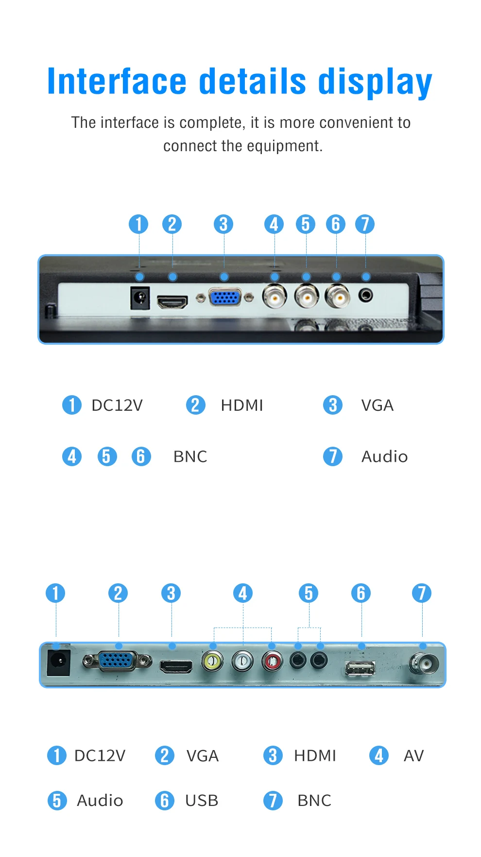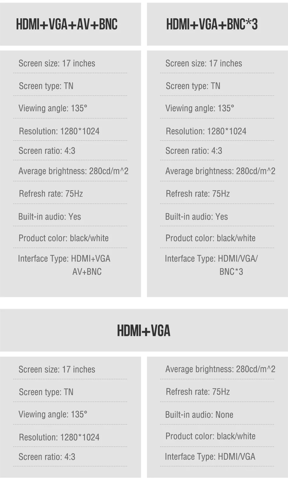 Размер экрана: 17 дюймовСоотношение экрана: 4:3Монитор имеет 2-4 типа интерфейса (4 SKUs):1,17 "1280x1024 Тип интерфейса: VGA / HDMI/Встроенный динамик2,17 "1280x1024 Тип мульти-интерфейса: VGA/HDMI/BNC x 3/Встроенный динамик