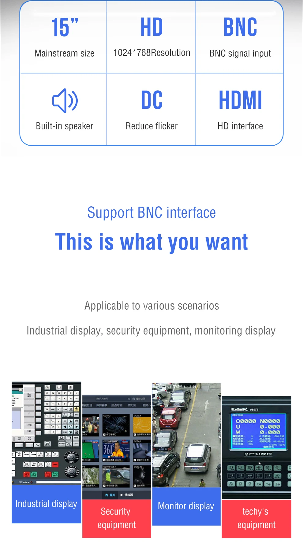 Размер экрана: 15 ДюймовСоотношение экрана: 4:3Монитор имеет 2 типа интерфейса (4 SKUs):1,15 "1024x768 Тип интерфейса: VGA / HDMI/встроенный динамик2,15 "1024x768 Тип мульти-интерфейса: VGA/HDMI/BNC x 3/Встроенный динамик