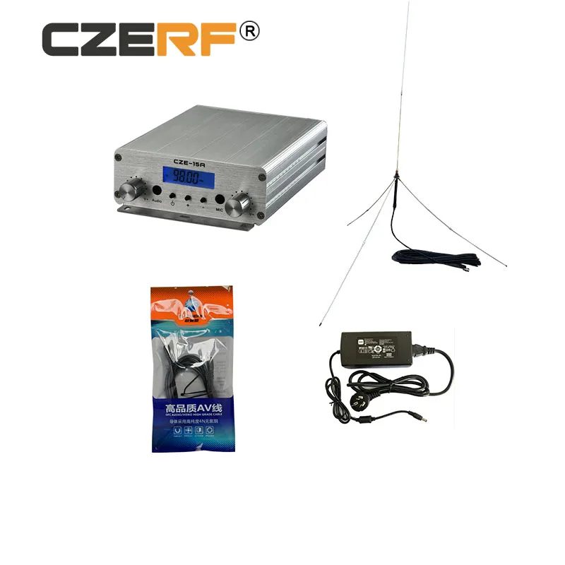 1 * CZE-15A 0-15 Вт FM Tranamitter1*1*3,5 мм стерео аудио кабель1*1/4 волна GP антенна с кабелем 15 метров
