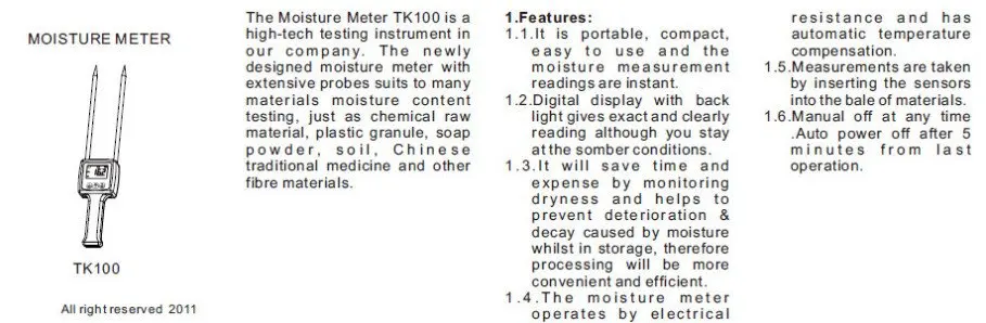 Измеритель влажности TK100 является высокотехнологичным инструментом тестирования в нашей компании. Недавно разработанный измеритель влажности с обширными зондами подходит для многих материалов для тестирования содержания влаги, так же как зерна, химическое сырье, пластиковые гранулы, мыльный порошок, почва, Китайская традиционная медицина и другие волоконные материалы.