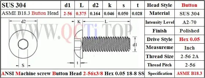 Винты из нержавеющей стали 2-56x38, шлифованная головка с шестигранным отверстием, ROHS, 100 шт.