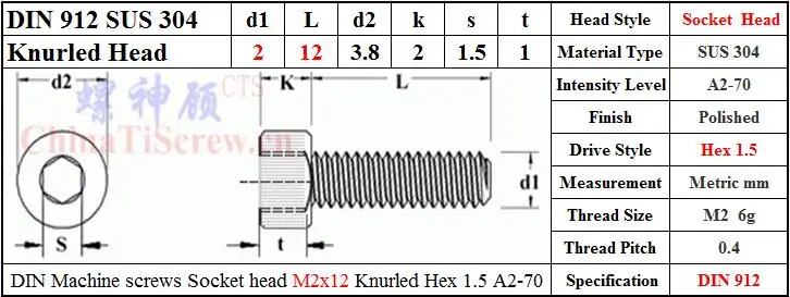 Накатанные винты M2 из нержавеющей стали 2x5 M2x6 M2x8 M2x12 DIN 912, шестигранный хвостовик 1,5, стандартный полированный ROHS 100 шт. QCTI винт