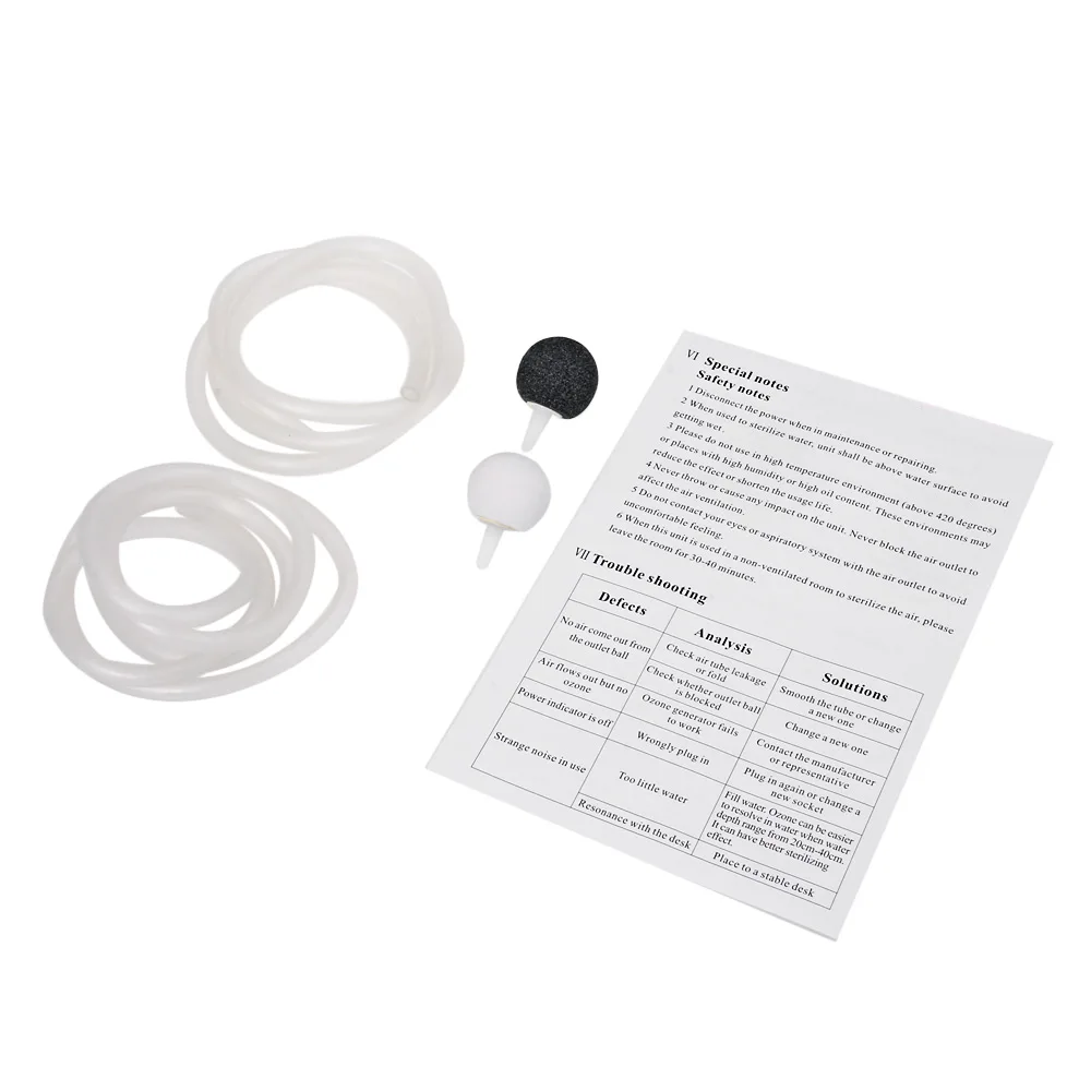 Посылка: 1 генератор озона, 2 воздуховода, 2 воздушных камня, 1 руководство пользователя на английском языке