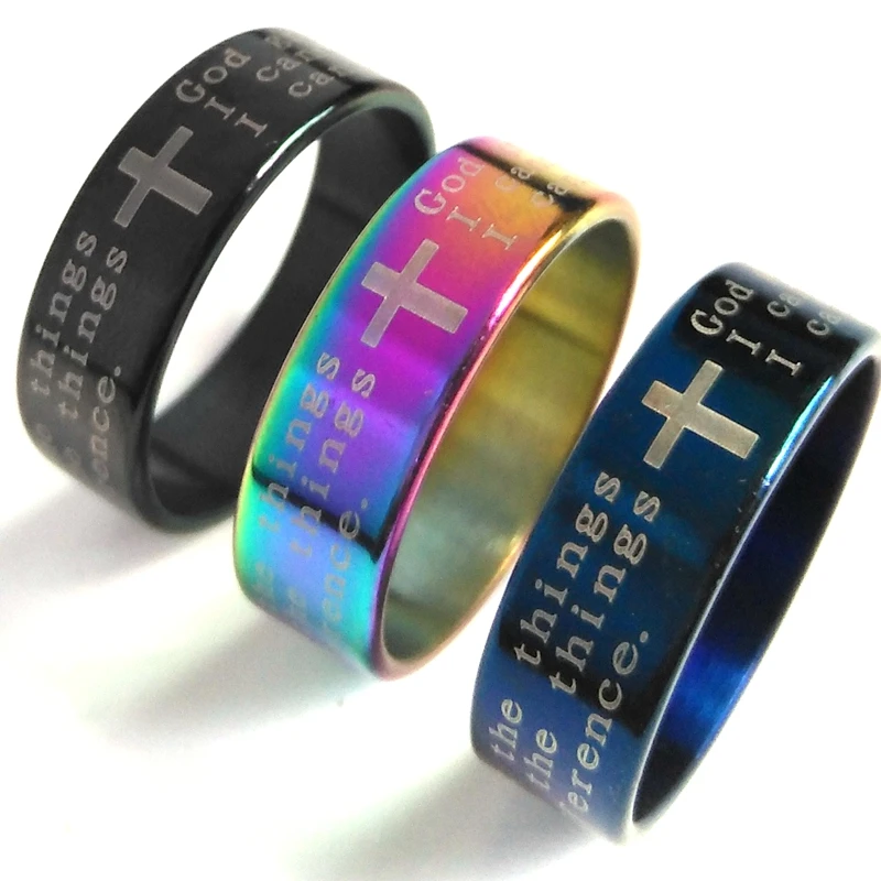 Оптом, 50 шт в наборе Молитва о душевном спокойствии Библейский Крест Иисуса нержавеющей стали кольца для мужчин для женщин модные религиозные украшения черный цвет радуги синий микс