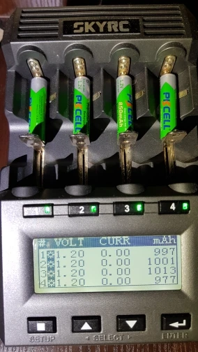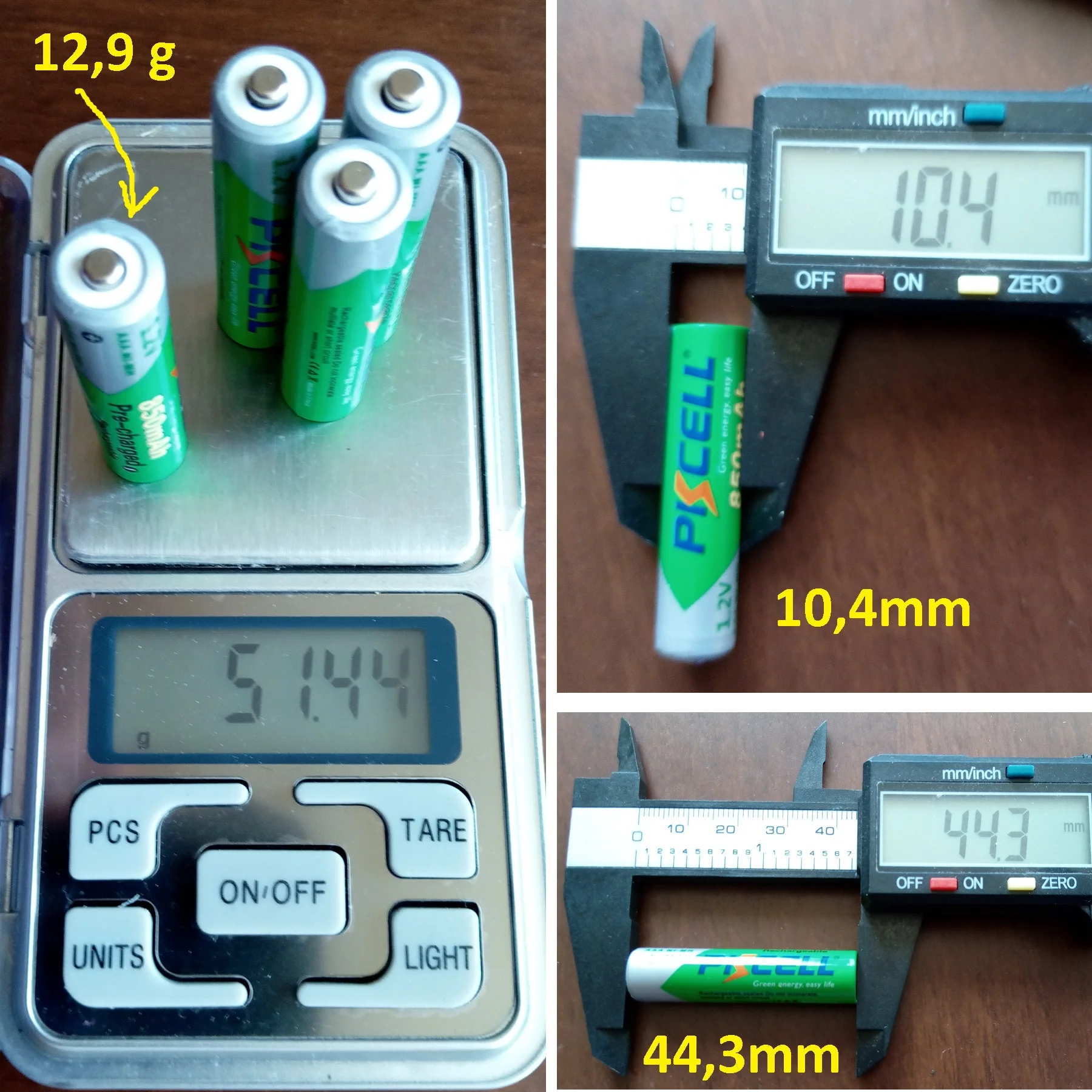 Всё отлично, очень доволен. Отдал все на проверку, и вот результаты: ёмкость около 800-900мАч, измеряли в режиме NOR TEST 300mA на зарядном устройстве Lii-500. Ёмкость измеряли по несколько раз. Первое измерение показало ёмкость около 830-880мАч, а при последующих замерах ёмкость поднялась до 900мАч. Внутреннее сопротивление около 30-40mOm, измеряли на YR1035+. Приехали заряженными до 1,25-1,26v. Даты производства на аккумуляторах и на упаковке не нашёл. Размеры: 44,3х10,5мм. Вес одного аккумулятора в среднем около 12,9г. Наверняка всё зависит от партии, которая попадётся, но результаты измерений меня порадовали. Попались достаточно хорошие аккумуляторы. Заряжаю их в основном током 0,1-0,3A. Покупал для пирометра, пультов ДУ, а так же использую в электронных весах, в радиомышках, и в измерительных приборах. Товар выслали в течение дня, в коробочке. Аккумуляторы были в блистерах по 4х и замотаны дополнительно в пупырку. Посылка отслеживалась на всём пути и доехала за 12 дней. Very good.
