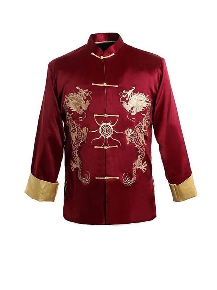 Бордовая традиционная китайская мужская куртка Кунг-у пальто рубашка вышивка с драконом M XL XXXL оптом и в розницу