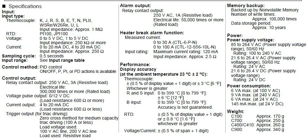 Основные Выход: реле ПИД охлаждение/контроль нагрева 1 реле тревоги: нормальное открытие, емкость 250 В/3A AC или 30 В/3A DC 7 различных сочетаний с двумя выходами с: высоким/низким/высоким отклонением/низким отклонением/интервалом/выходом интервала/сигналом о поломке Точность: 0.5% Вход: K,J,E,R,S,PT100,Cu50 Измерение: DIN: 1/16 (48 мм x 48 мм x 110 мм) Вес: Около 200 г Индивидуально Программируемые параметры PID управления. P, I, d, период управления, коэффициент цифрового фильтра и многое другое Управление реле готово к подключению Компактный дизайн: DIN 1/8 большой форм-фактор для включения/сборки вашего продукта. Вход: TC(K, J, S, E) / RTD (Pt100, CU50) Универсальный вход или сигнал 0-20 мА. Управление выход: Реле Выходной сигнал тревоги: 1 линейный выход, 7 видов режима сигнализации: Высокое/низкое/высокое отклонение/низкое отклонение/интервал/выход интервала/поломка тревоги.