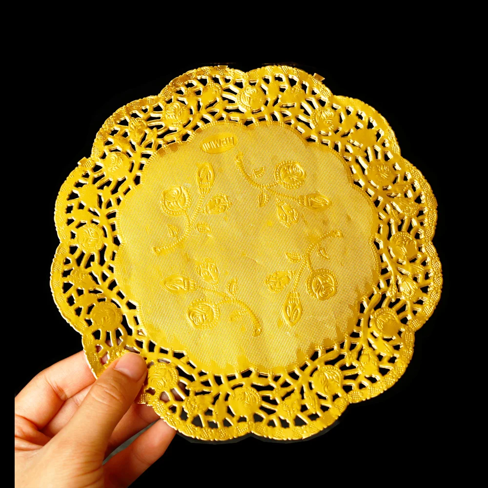 100 шт. 8,5 "10,5 дюйма Золотая фольга салфетки серебряная фольга круглые кружевные бумажные салфетки бумажные коврики для торта украшение вечерние стола