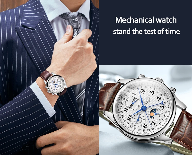Часы мужские механические водонепроницаемые с автоподзаводом и календарем на кожаном ремешке