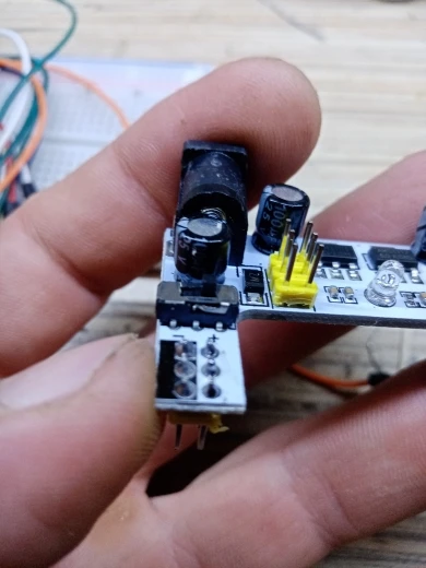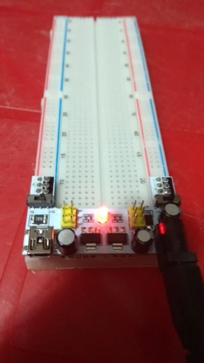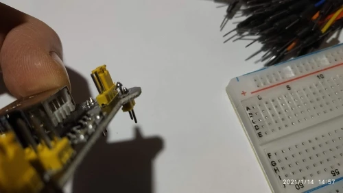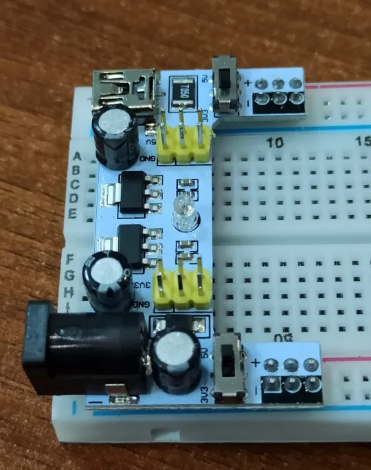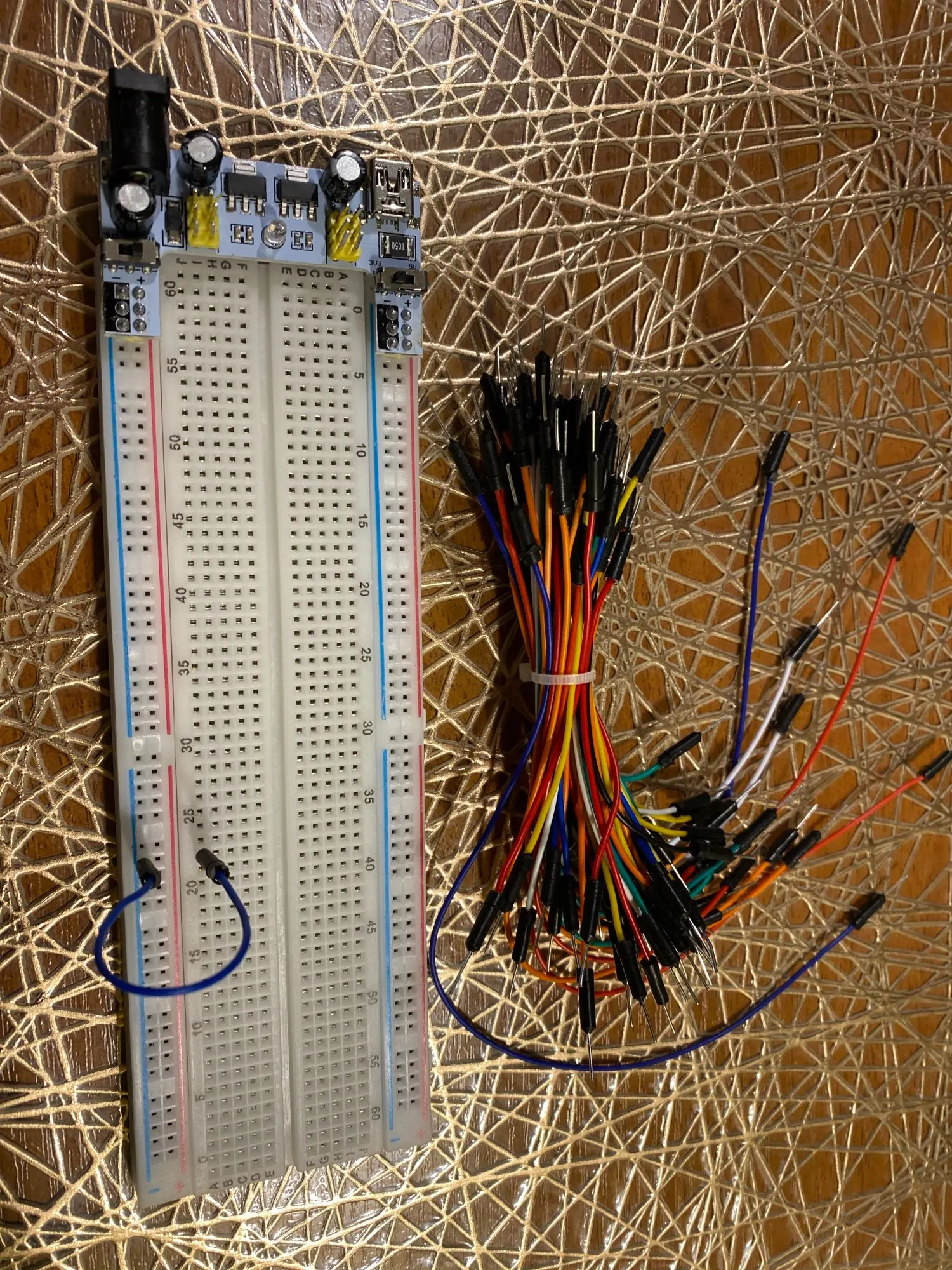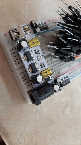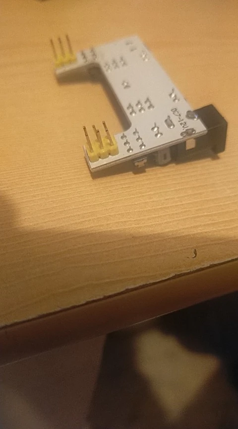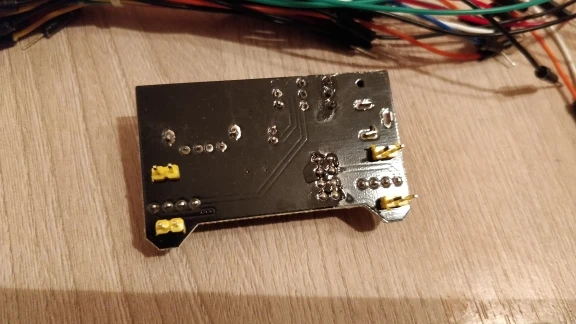 Посылка пришла без особых задержек. Провода хорошие, гибкие. Плата питания работает исправно как от юсб так и от бп. Гнездо впаяно криво. С обратной стороны макетки наклеен двусторонний скотч. Можно будет налепить её на какую то основу.