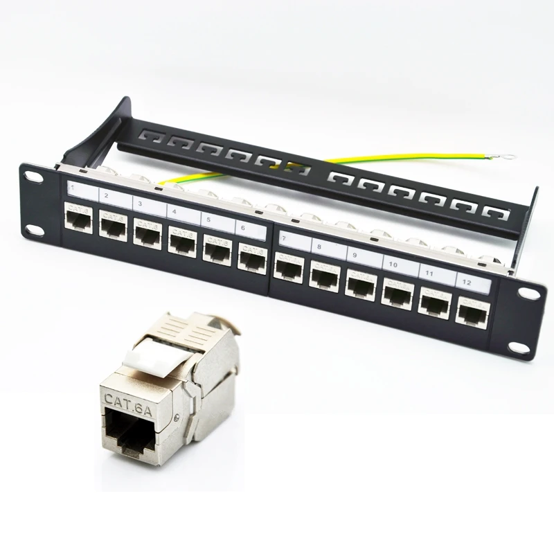 10 дюймов, 12 портов, патч-панель Cat6a, загруженный Cat6a Keystone Jack и кабельная панель управления