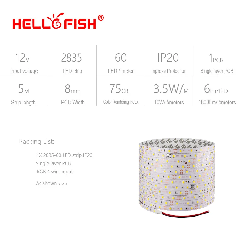 Гибкая светодиодная лента Hello Fish, 5 м, 300 светодиосветодиодный, 2835 SMD, 12 В, 60 светодиодный одовм, RGBбелыйтеплый белыйсинийзеленыйкрасныйжелтый