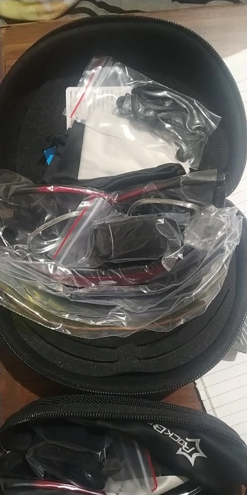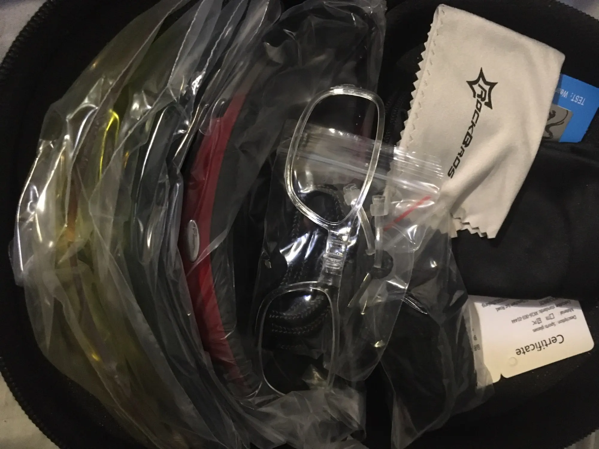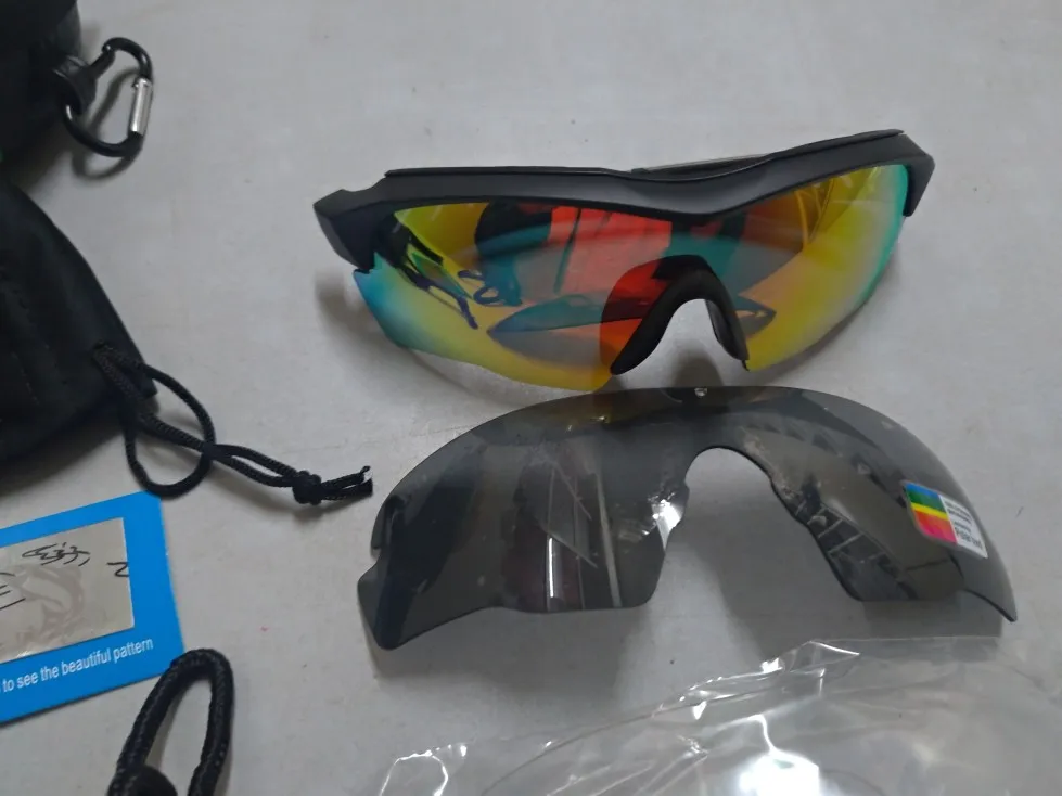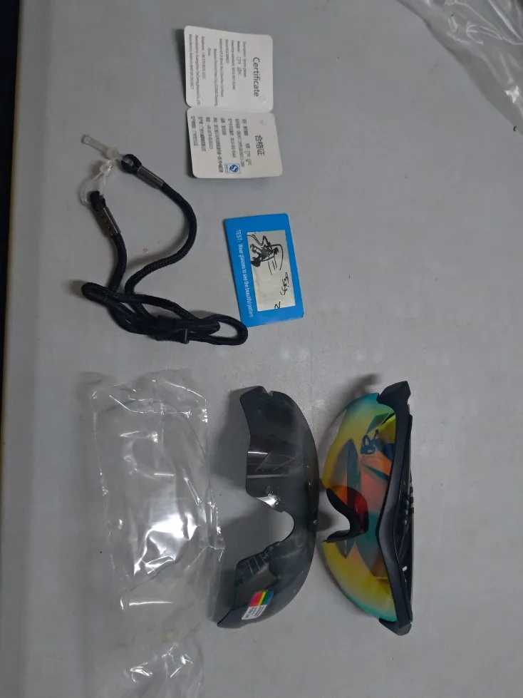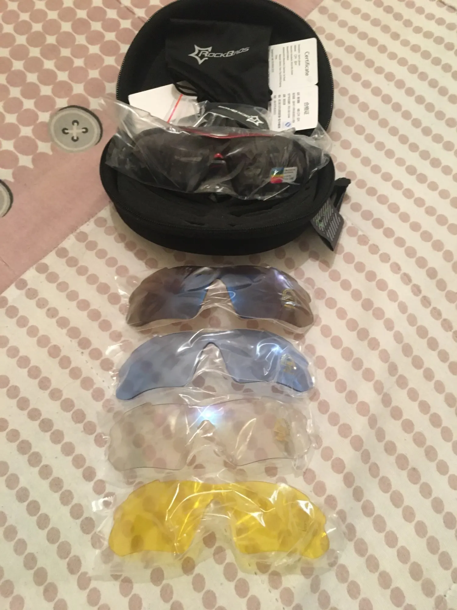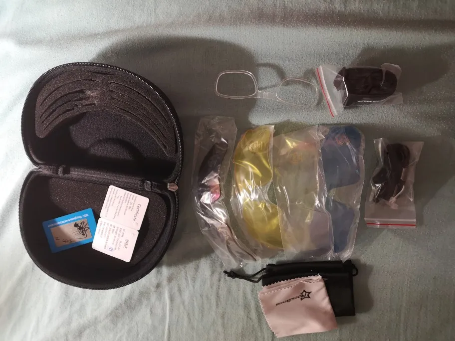 Очки пришли в комплекте со всем необходимым: футляр твёрдый, очки, 5 линз(поляризационные, синие жёлтые, коричневые, прозрачные), мягкий, более компактный чехол, картонка для тестирования поляризационных линз, вместо дужек можно поставить резинку, которая тоже идёт в комплекте, шнурок чтобы дужки к голове притягивать. Rockbros, спасибо!!!